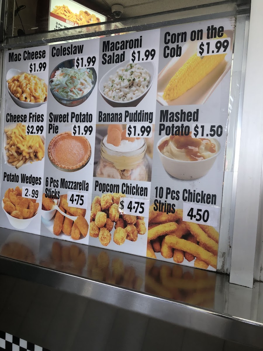 Popcorn chicken paired with your choice of side and drink. Drink selections include soft drinks and water. Side options range from fries to mac & cheese to corn on the cob.